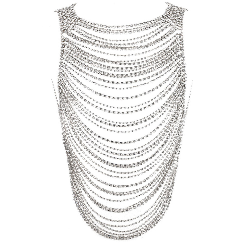 Cette pièce statement, faite de chaînes fines et de strass étincelants, épouse la silhouette et crée un effet de cascade lumineuse absolument irrésistible.