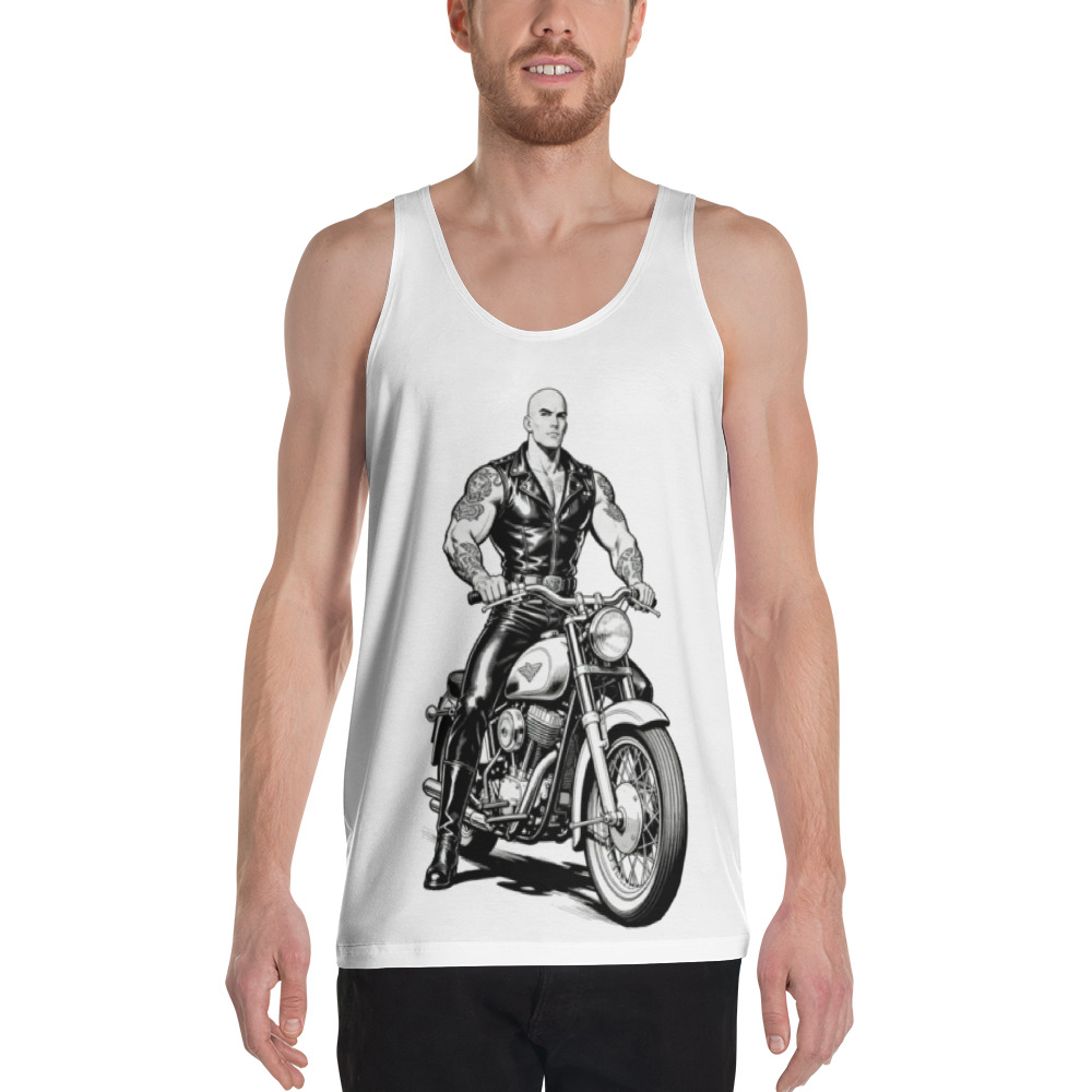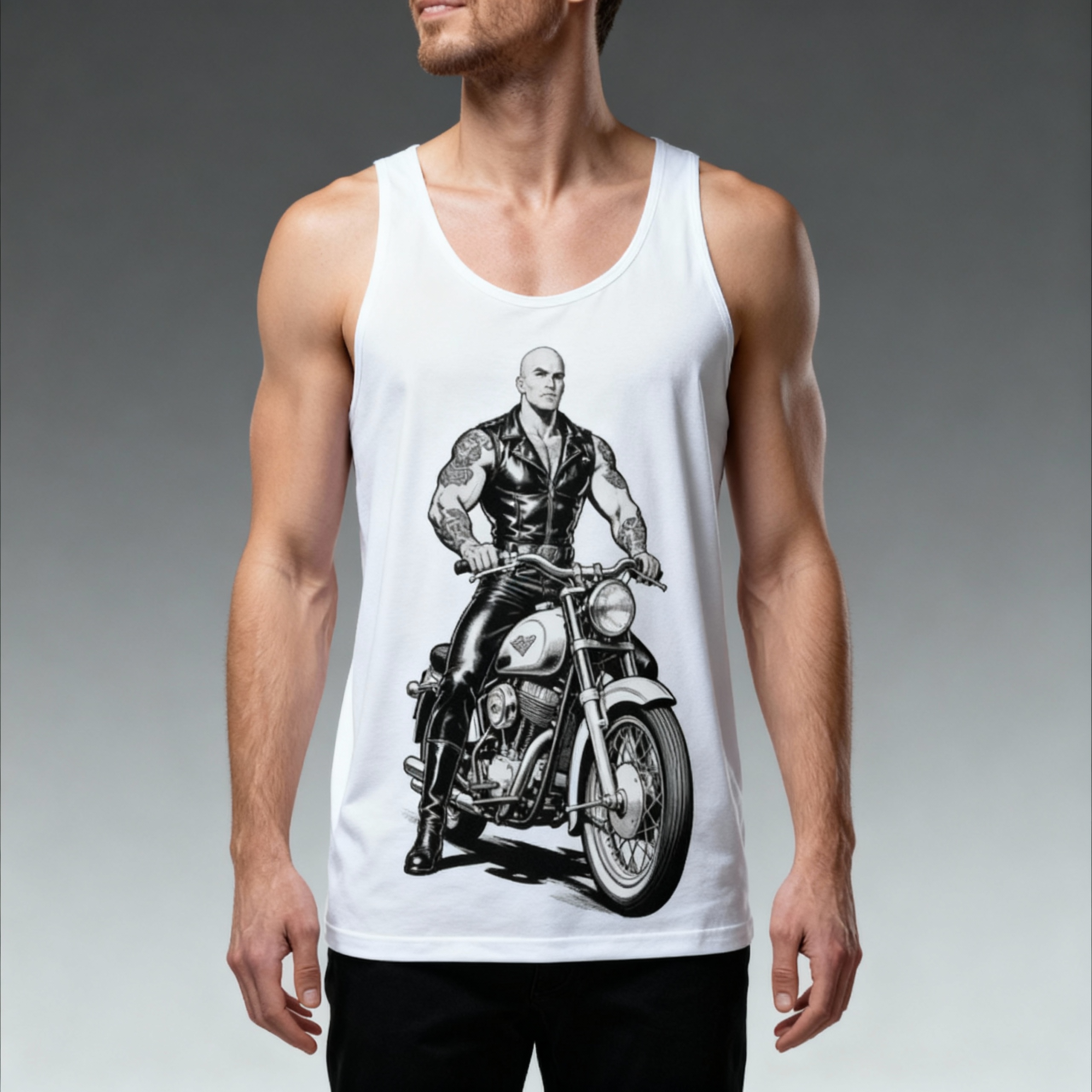 Dessus, un motard sexy, tatoué, calme… mais on devine que sa bécane n’est pas la seule chose qu’il sait chevaucher.