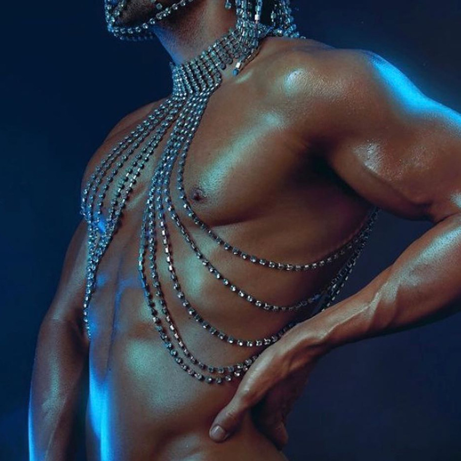 Cette chaîne corporelle à franges, entièrement sertie de strass, glisse sur le torse et crée un mouvement hypnotique à chaque geste. Le design multi-couches souligne les lignes du corps et ajoute une touche de luxe provocante, parfaite pour les soirées, la scène, les shootings ou les looks très privés.