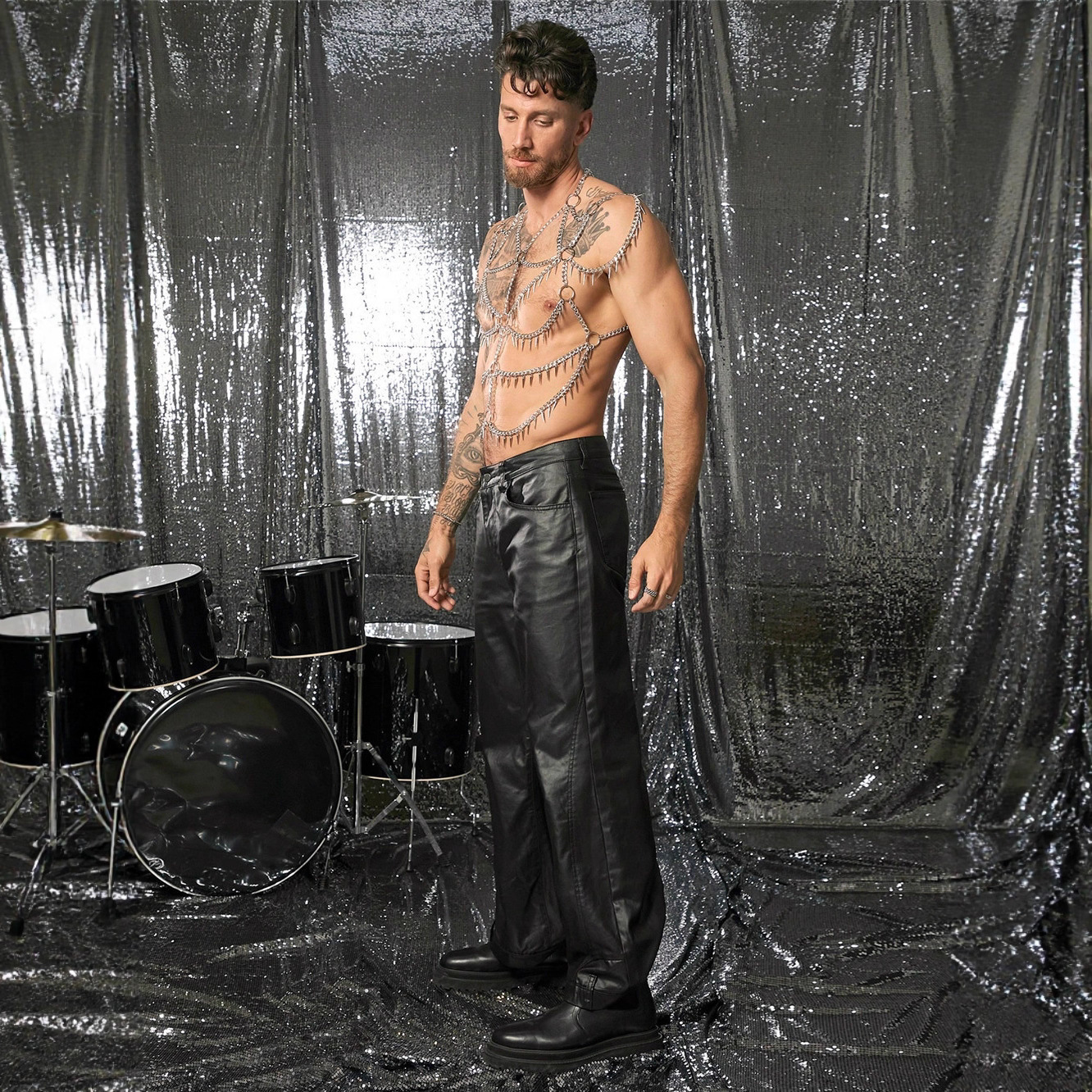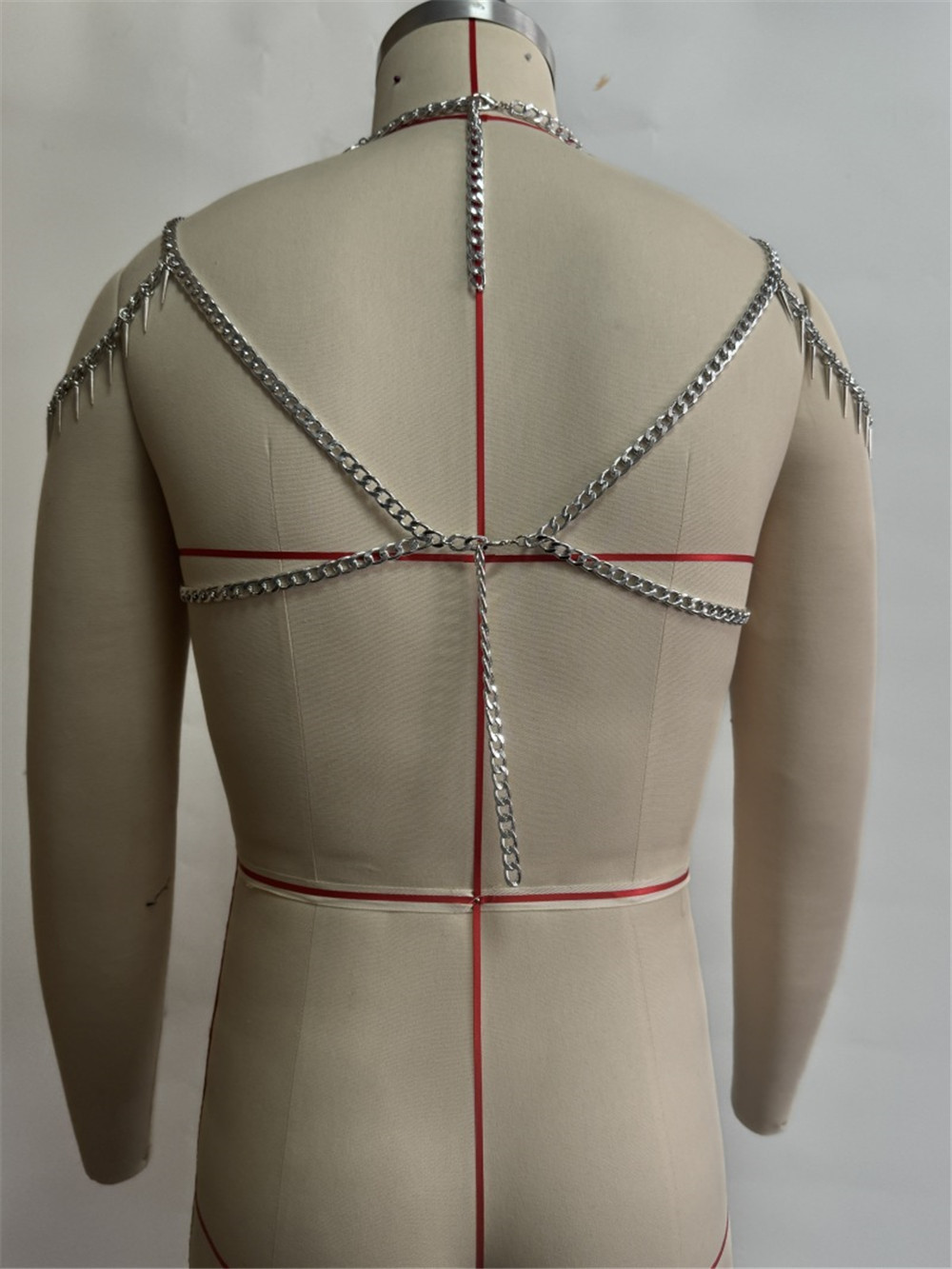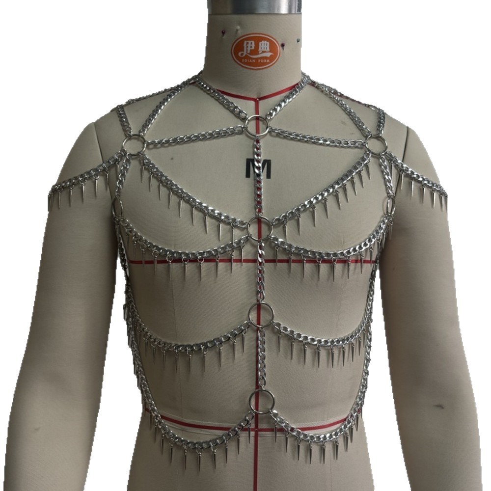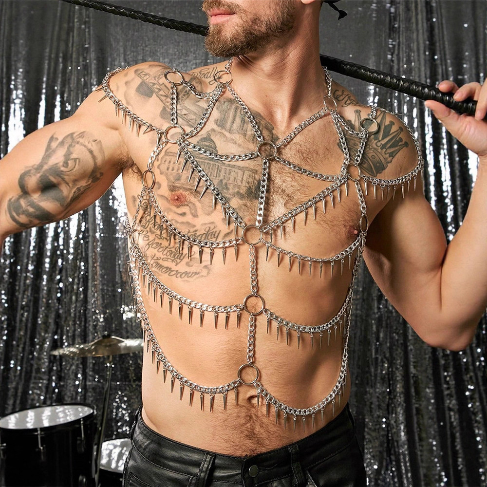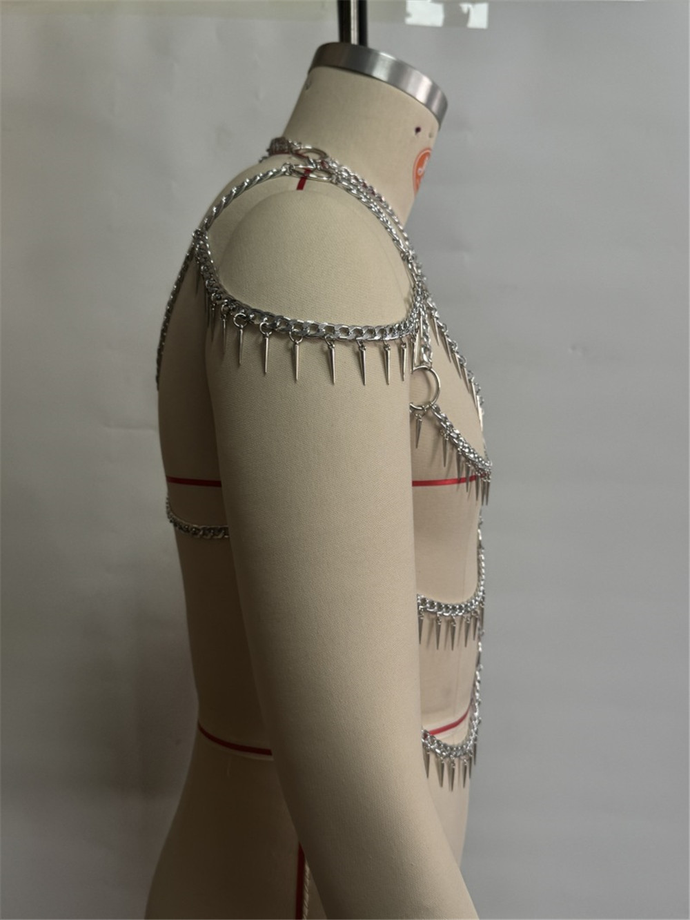Ce harnais combine chaînes épaisses, anneaux centraux, et rangées de petites pointes pour créer une pièce visuelle forte, idéale pour les looks de soirée, performances, shootings ou clubwear.