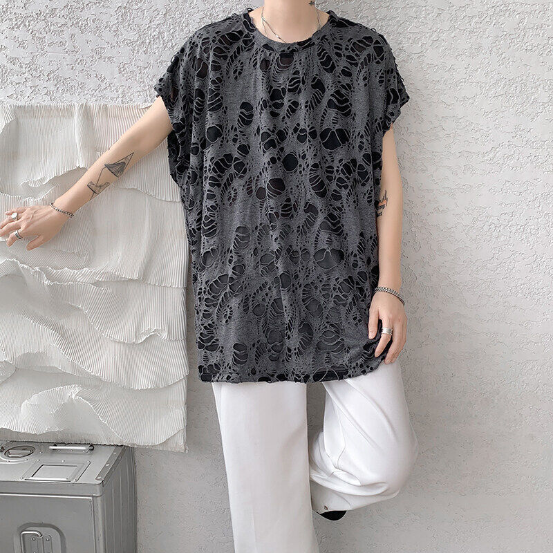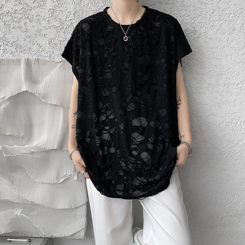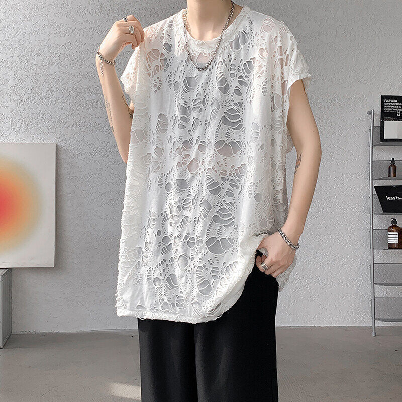 T-shirt long en texture ajourée pour homme — transparence sombre & allure provocante
