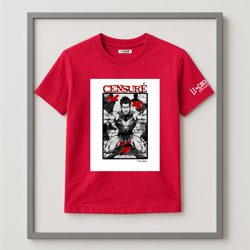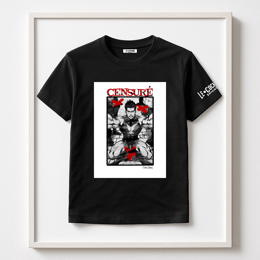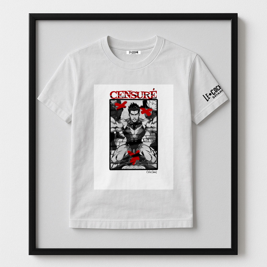 Chaque t-shirt devient un manifeste : un tableau sensuel, graphiquement osé, frappé du sceau rouge de la censure — symbole de résistance face aux conventions.