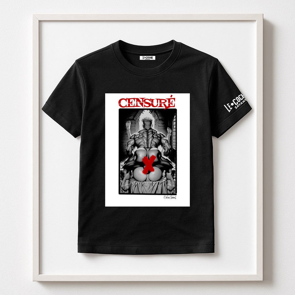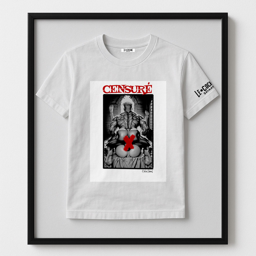 Chaque t-shirt devient un manifeste : un tableau sensuel, graphiquement osé, frappé du sceau rouge de la censure — symbole de résistance face aux conventions.